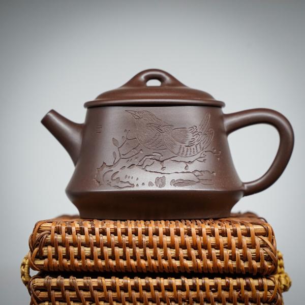 Добротный мастеровой исинец. Печати изготовителя на тельце, ручке и крышечке чайника. Украшен рельефным рисунком птиц на одной из стенок и иероглифами на другой. Сертификат изготовителя идет в комплекте.