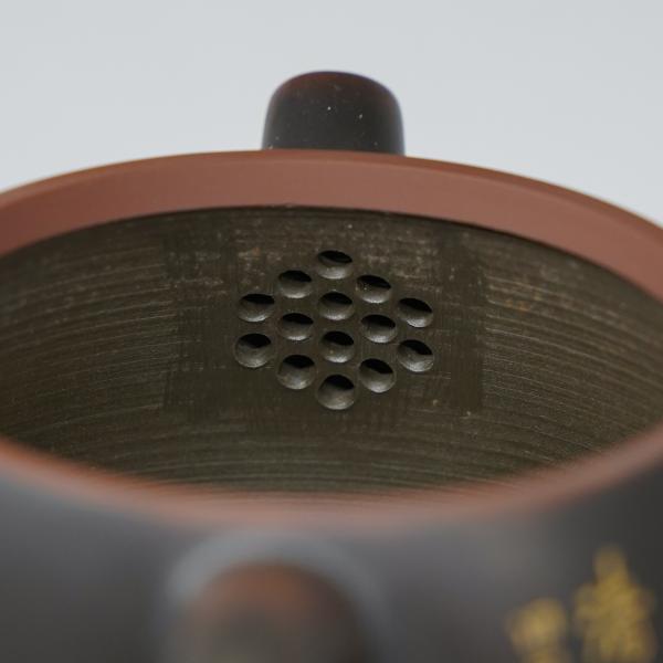 Отлично держит тепло. Прижимающая (压盖 yagai) крышечка с шаровидной (球形钮 qiu xing niu) пуговкой превосходной притирки. Форма сита – Пин Кун (平孔) с 14 отверстиями. Ровный аккуратный слив.