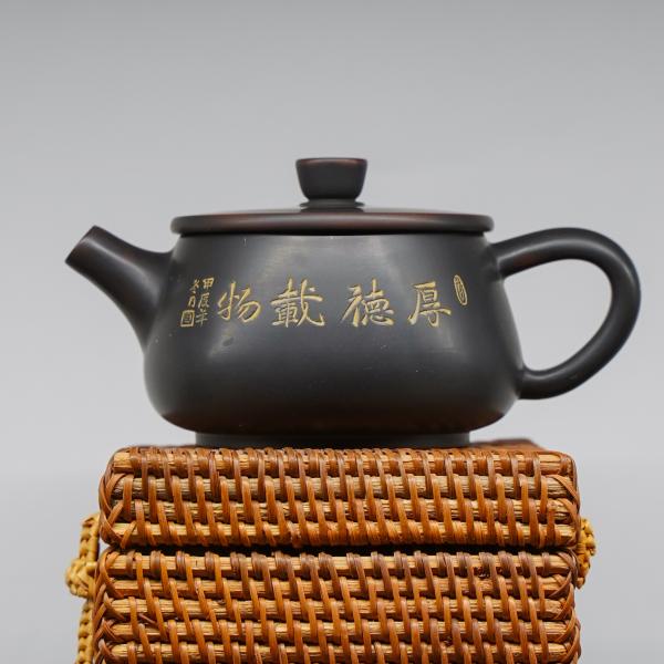 Уникальный чайник из легендарной циньчжоуской керамики (Нисин Тао 坭兴陶), выполненный в традиционной форме Ши Пяо «Каменный ковш». Искусная ручная работа. Украшен художественной инкрустацией.