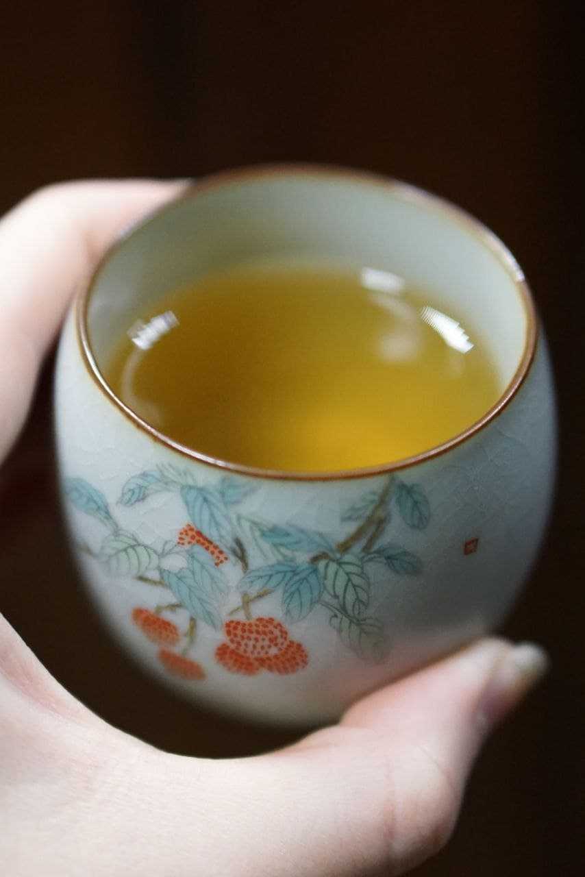 Керамическая пиала «Ягоды» расписана вручную и дополнительно украшена темной каемкой на горлышке. Тело пиалы округлое и гладкое, держать ее очень удобно. Форма называется нуань шоу бэй (暖手杯, «греющая руки») – она идеально подходит для чаепития в холодную погоду и располагает к вкушению тонких ароматов чайного настоя. Оттенок пиалы нежный, светло-голубой.