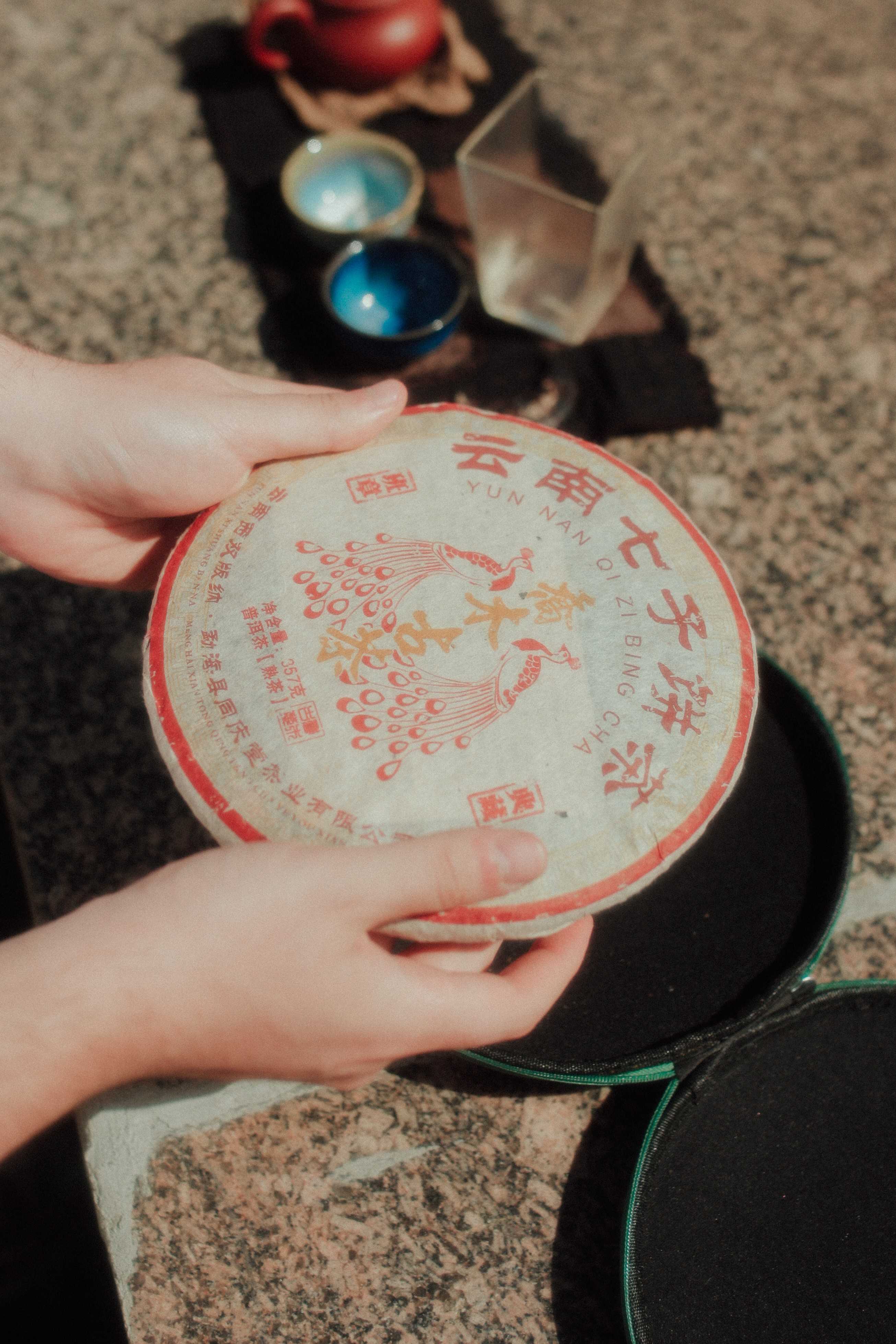 Выдержанный шу пуэр Цяо Му Гу Ча (喬木古茶 qiáomù gǔ chá) от фабрики Тун Цин Тан (同庆堂 tóng qìng táng). Приготовлен 18 декабря 2012 года. На обложке изображены два павлина — символ округа Сишуанбаньна.